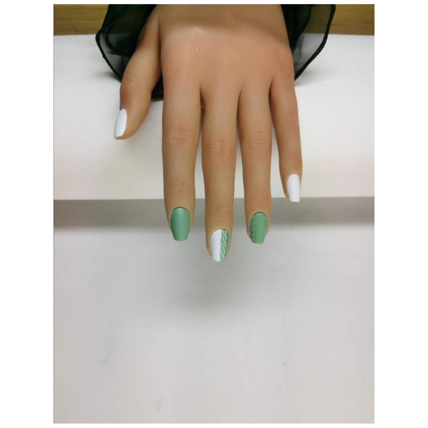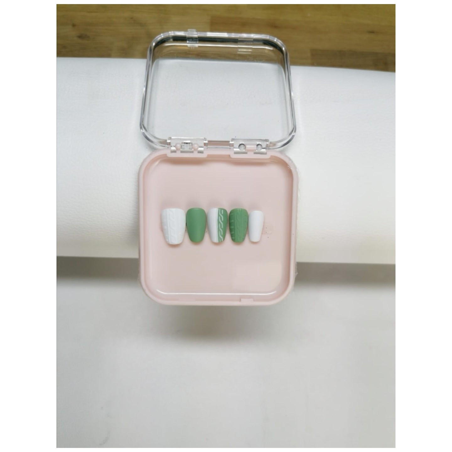 Press-on nails vert sauge & blanc effet tricot. Style cosy, hivernal et minimaliste. Capsules réutilisables, pose rapide et tenue longue durée.