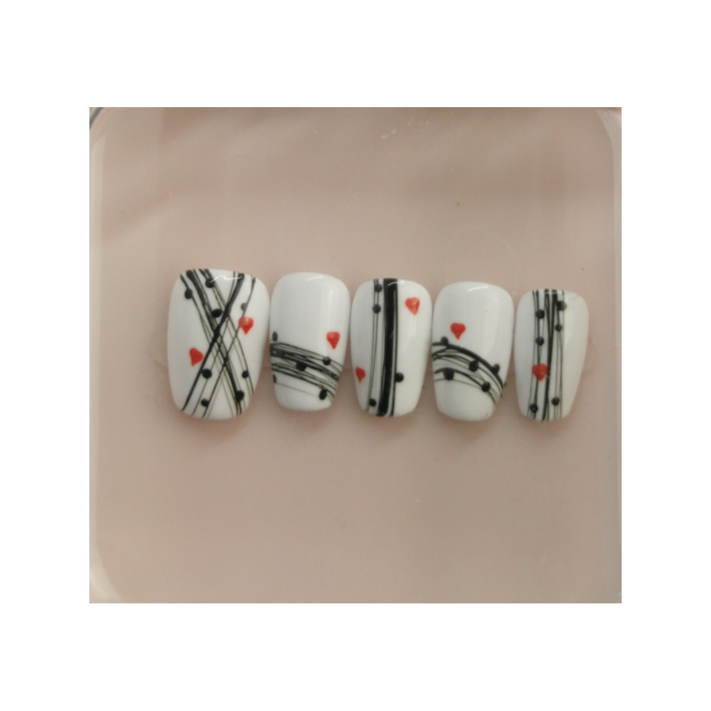 Press-on nails blancs graphiques avec lignes noires et petits cœurs rouges. Un look minimaliste, romantique et moderne, idéal pour Saint-Valentin ou quotidien chic.