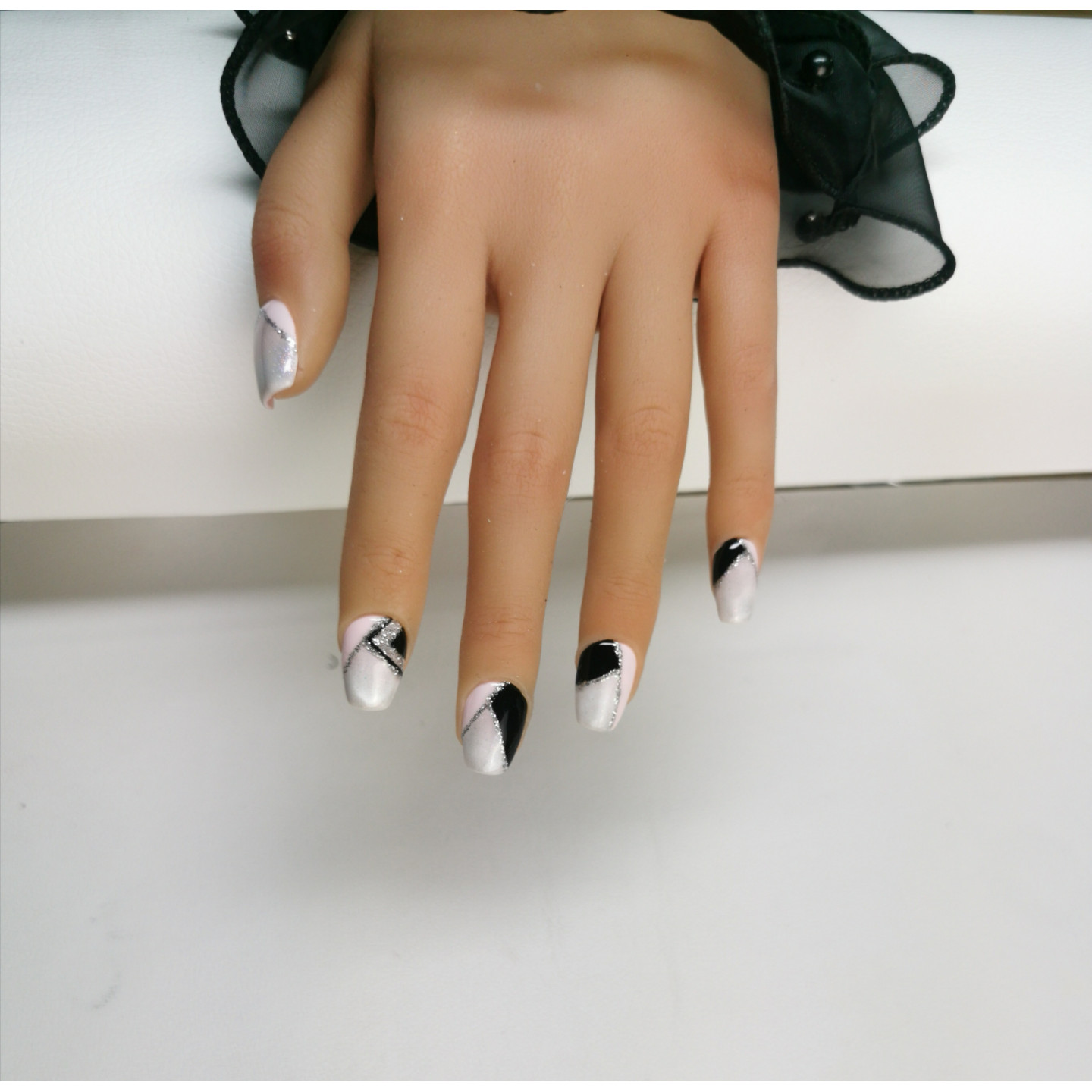 Optez pour une manucure chic et sophistiquée avec ce set de press-on nails nude, noir et argent, décoré d’un design géométrique élégant.