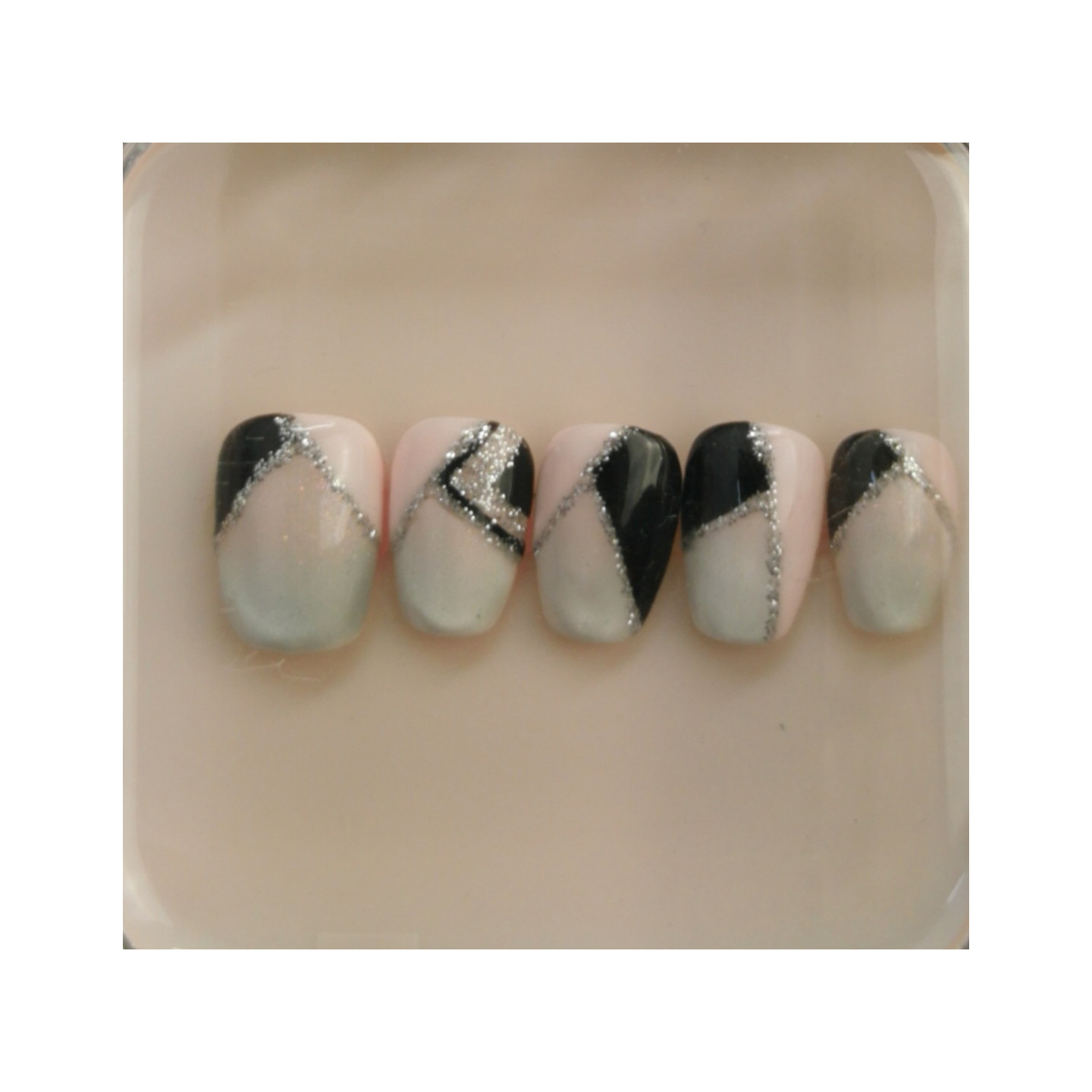 Press-on nails nude, noir & argent avec design géométrique pailleté. Chic, élégant et moderne. Capsules réutilisables — pose rapide.