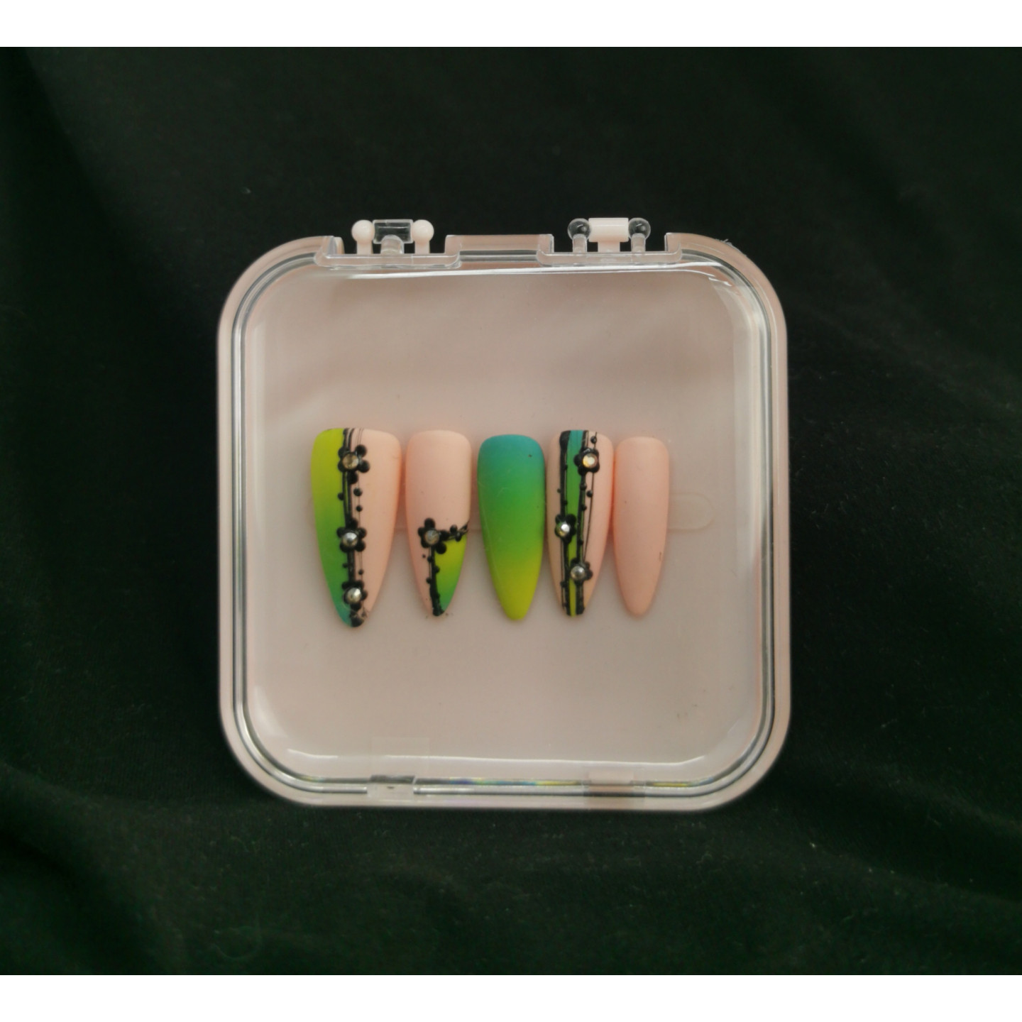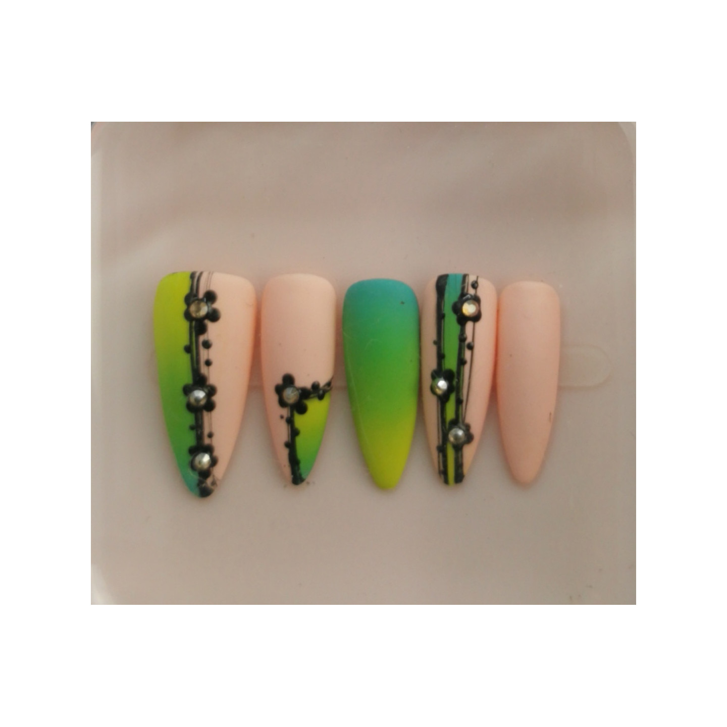 Adoptez un style frais, moderne et élégant avec ce set de press-on nails nude, vert & jaune dégradé, décoré de petites fleurs noires stylisées et de strass brillants.