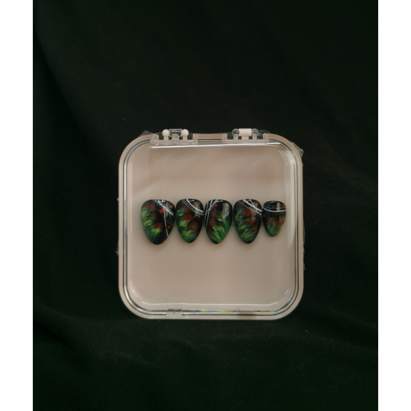 Press-on nails noirs effet fleurs abstraites rouges et feuillages verts. Design intense, artistique et élégant. Capsules réutilisables, pose rapide.