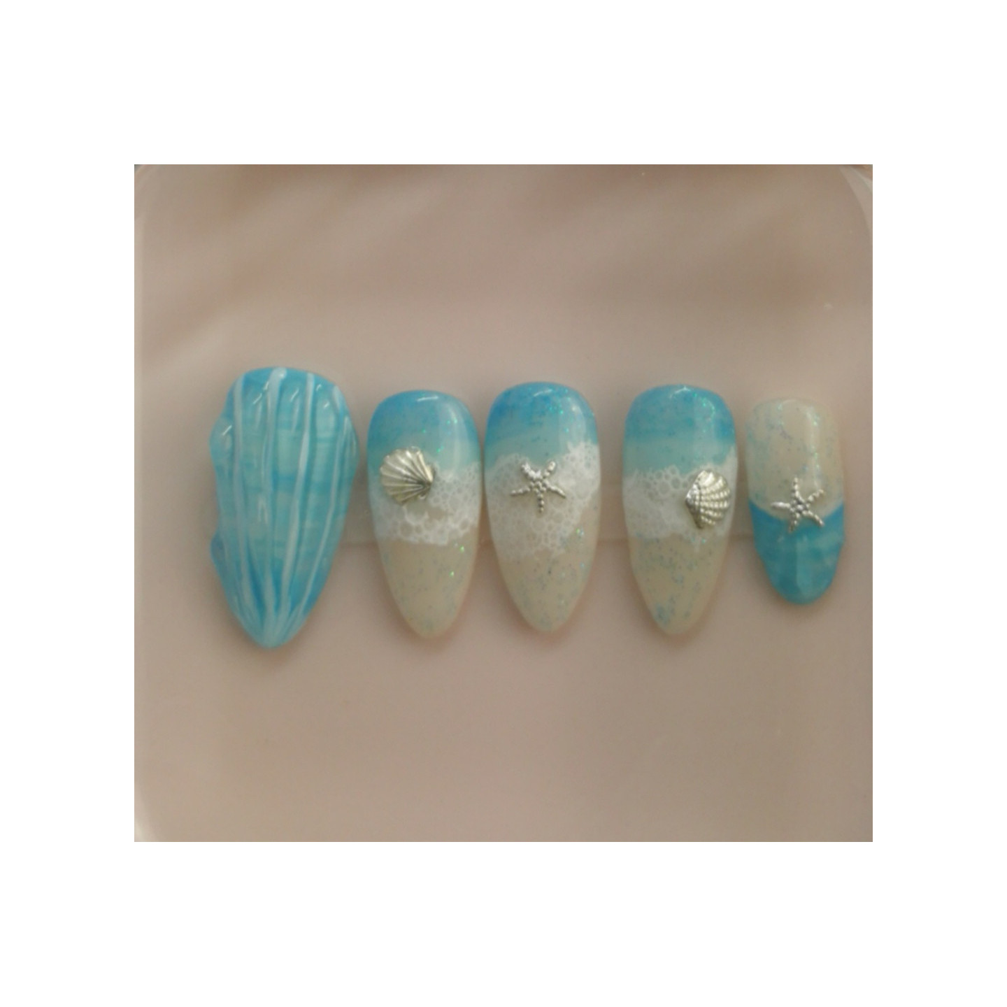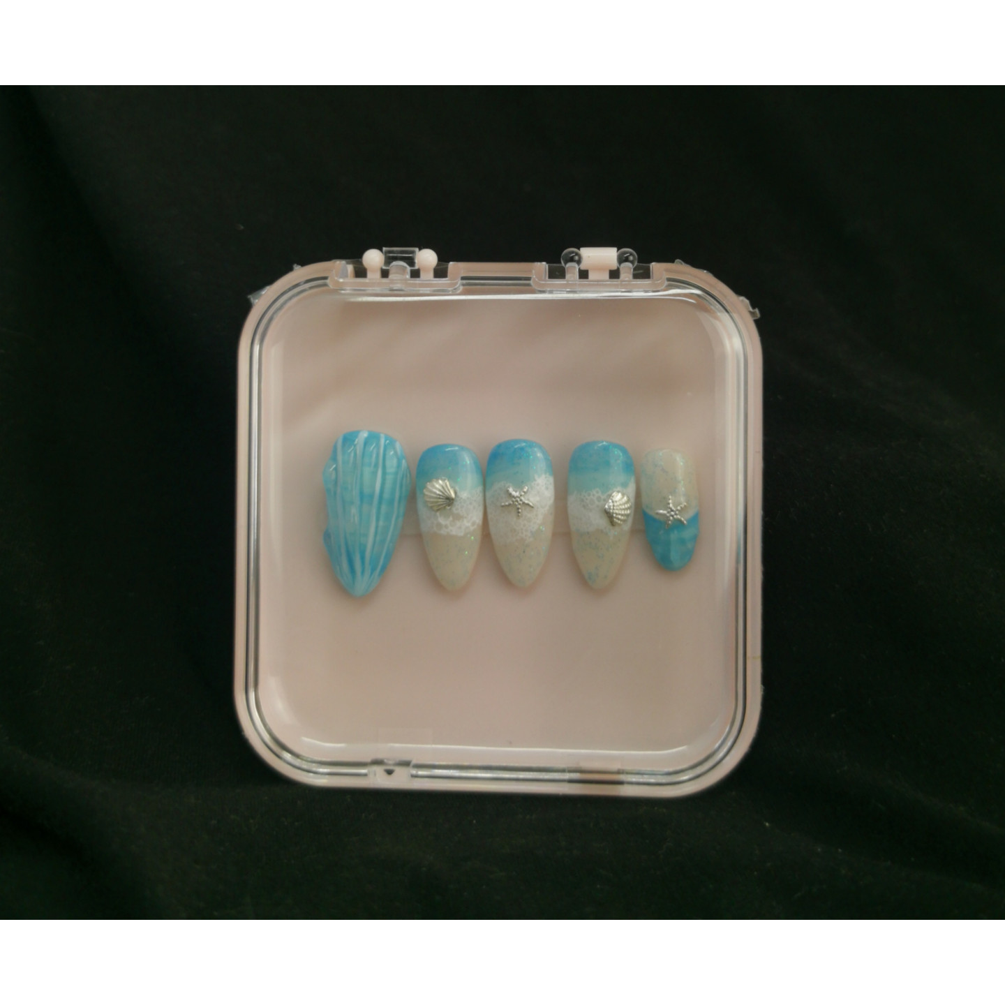 Apportez un vent de vacances à votre manucure avec ce magnifique set de press-on nails thème plage & océan, entièrement travaillé à la main.