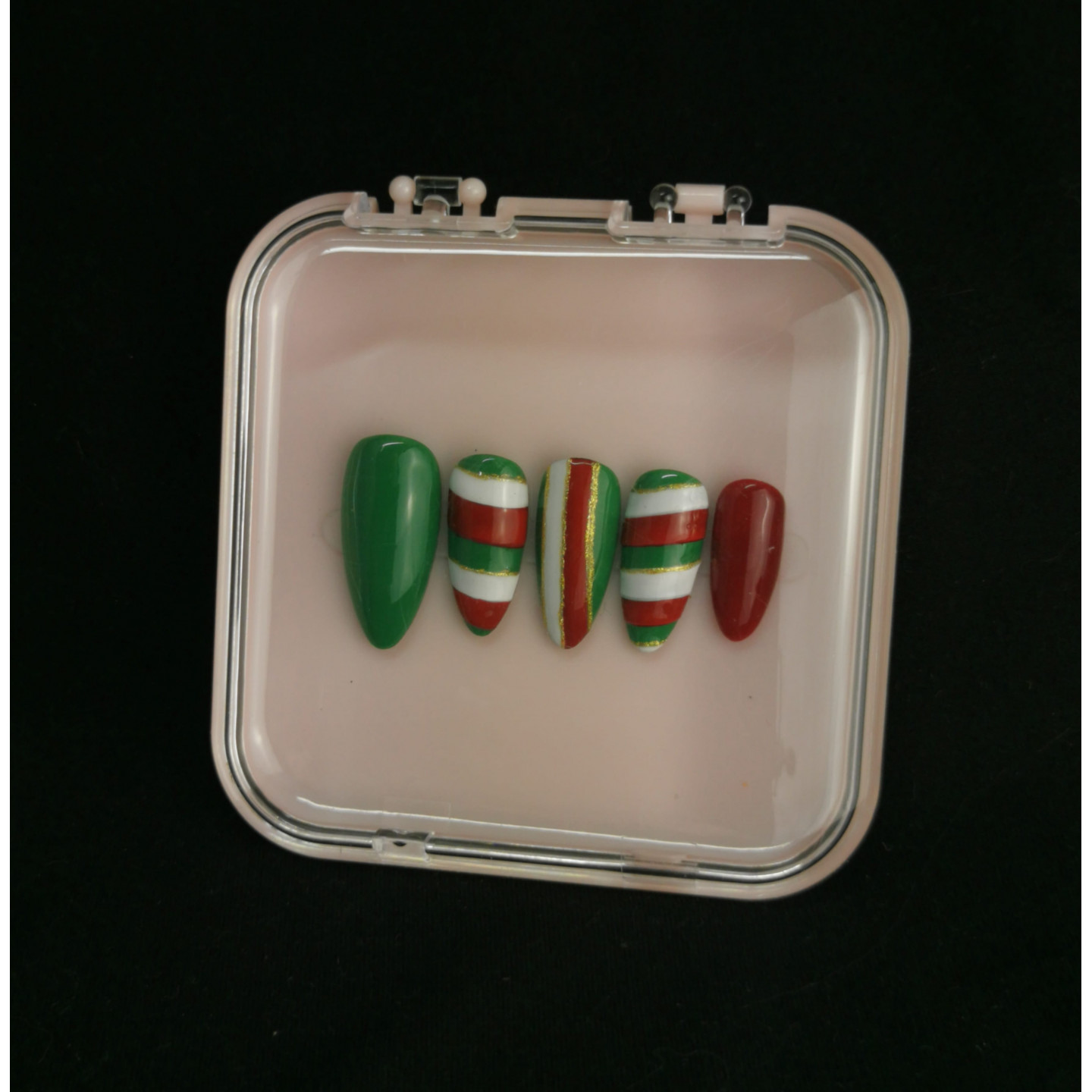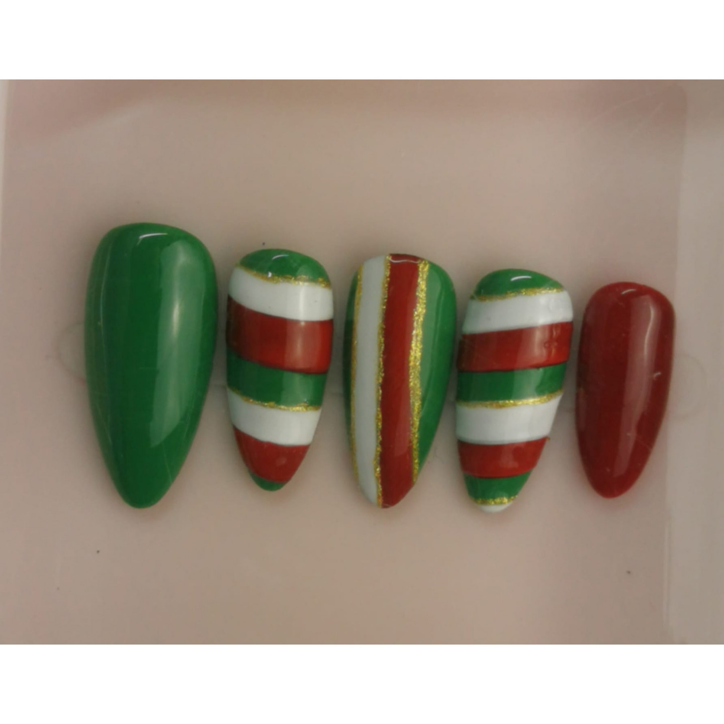 Press-on nails vert, rouge & blanc avec bandes façon sucre d’orge et liserés dorés. Style festif, joyeux et traditionnel. Capsules réutilisables, pose rapide, tenue durable.