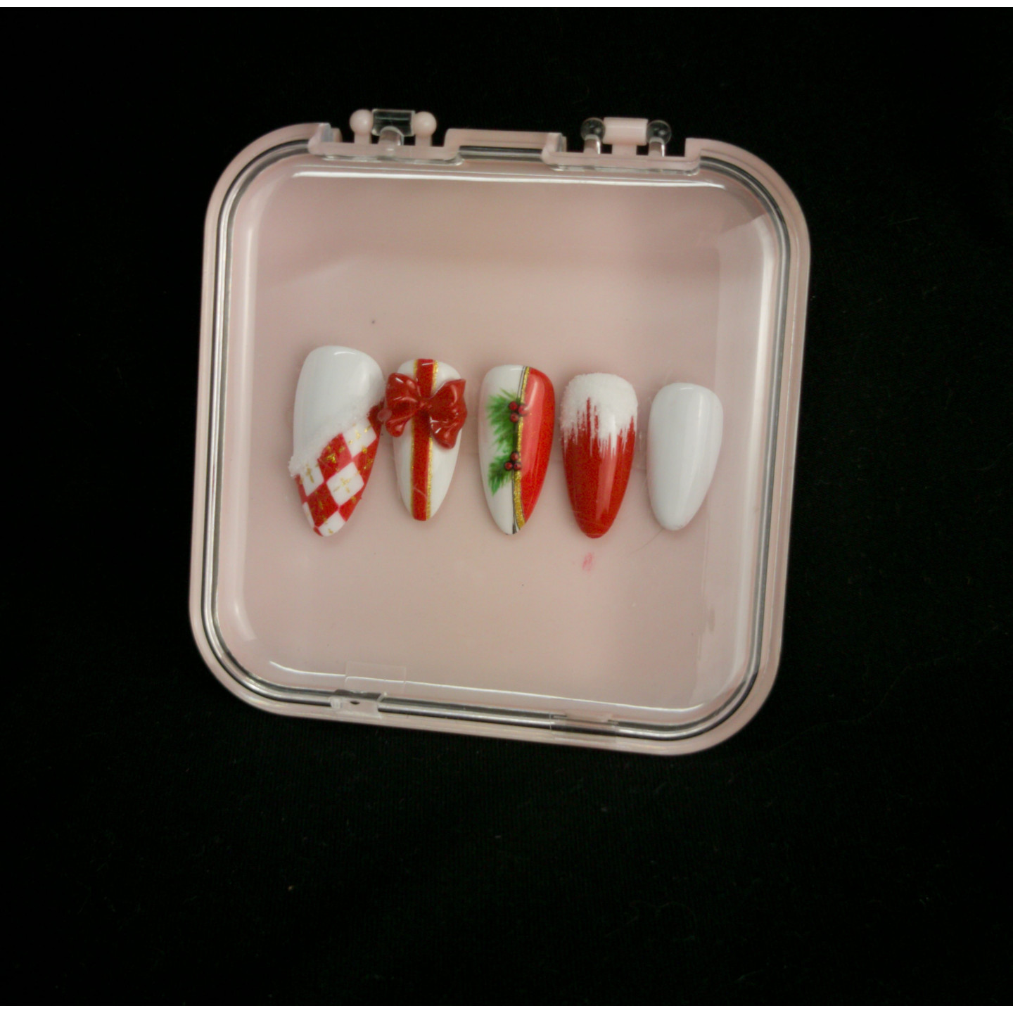 Découvrez notre set exclusif de press-on nails thème Noël, réalisés à la main avec un soin extrême du détail pour un rendu élégant, festif et unique. Chaque capsule est décorée de motifs hivernaux raffinés : damier rouge et blanc effet “Christmas Candy”, ruban 3D façon cadeau, branche de sapin et baies de houx, neige texturée et capsule rouge profond.